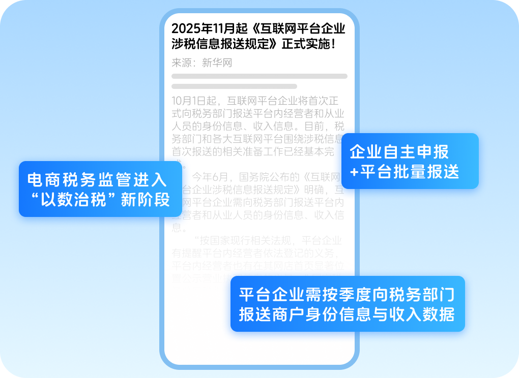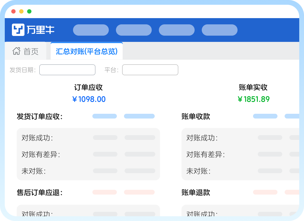 2025年6月,《互联网平台企业涉税信息报送规定》正式施行,标志着电商税务监管进入“以数治税”新阶段。对企业而言,唯有实现业务、财务、税务的全面协同,才能适应强监管环境,保障可持续发展。 而电商卖家在实际运营中,导致业务与财务不统一的核心症结,多源于“业务数据分散、操作不闭环、人工干预多”。 不少电商企业长期“业务先行、财务滞后”,诸多业务操作不规范却无法被财务识别,比如: 业务痛点 ✔ 多渠道数据割裂:跨平台 / 多店铺数据未汇总:同时运营淘宝、京东、抖音、私域商城等渠道,各平台订单、售后单、账单分散存储,统一至财务系统需手工核对; ✔ 审单不规范:随意修改商品应收金额、直接删除待发货商品等; ✔ 发货业务灵活:订单履约过程中经常进行拆合单操作,但是账单打款又是按照线上单,导致出库单和账单无法直接核对; ✔ 售后漏洞:线上退款直接记账,却未跟进货物是否实际退回; ✔ …… 电商订单瞬时单量大、玩法多、业务构成复杂,财务做账存在潜在风险,如果按照原来的流程,即“不对账-直接按月确认收入”,缺乏有效的对账机制,不仅容易导致潜在的税务风险,也容易造成业财割裂的现象。 在平台报送新规下,实现定期对账的自动化智能化,是确保商家税务合规的关键。 ►►► 万里牛ERP平台对账 平台双向对账 从下单到开票统统有迹可循! 针对电商卖家的以上场景和业务痛点,万里牛ERP推出平台自动对账功能,真正系统化地帮助电商企业,应对税务合规挑战! 01 多平台智能对账,一套系统抵N个人工 通过API + RPA自动化技术,无缝集成天猫、淘宝、拼多多、抖音、京东、快手等主流电商平台及支付系统,每日自动拉取店铺账单,智能识别超1000种费用项,实现按单精准核销,大幅提升对账效率与准确性。