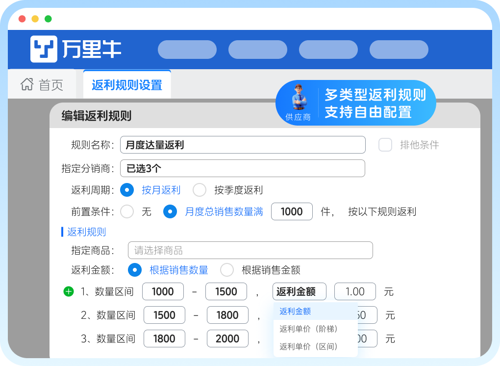 灵活配置返利模式:无论是月度达量的阶梯返利、主推品的专属激励,还是季度业绩的金额返利,均可灵活配置;