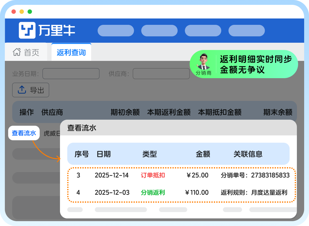 可实时查看每一笔返利的来源明细,销售数据与返利金额清晰可溯,争议率降低 95% 以上。