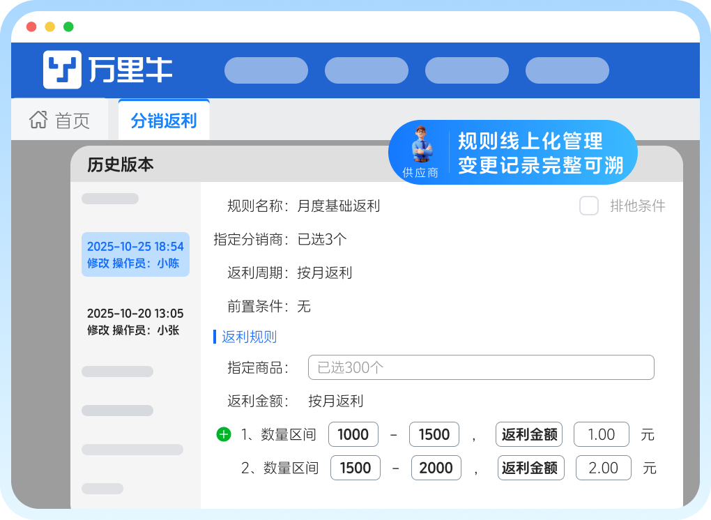所有返利政策均在线上统一发布、管理,规则变更实时同步,且每一次修改都有完整历史记录,随时可查可溯;