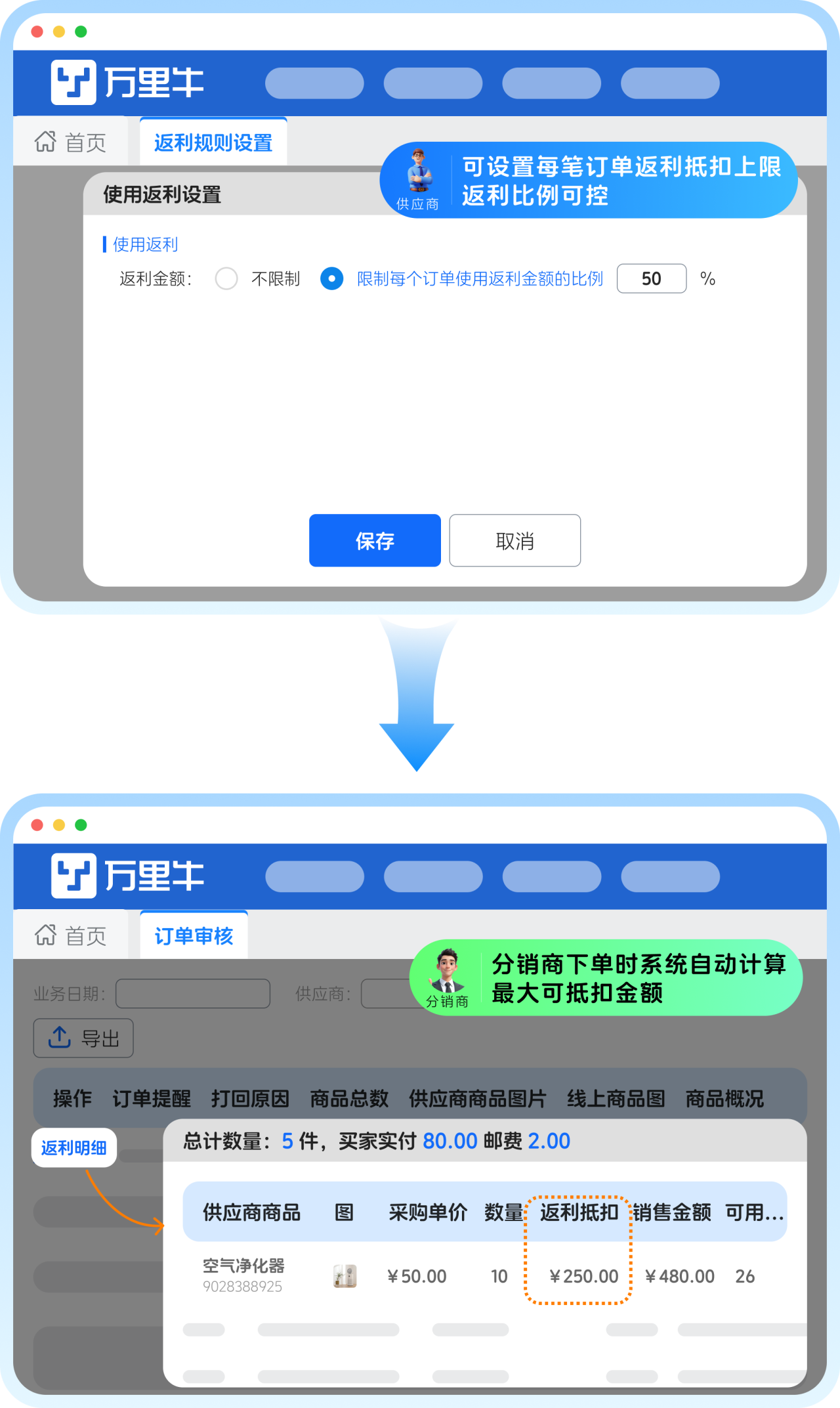 分销商下单时,系统自动计算最大可抵扣金额,无需手动申请,一键完成返利抵扣,流程流畅无断点;